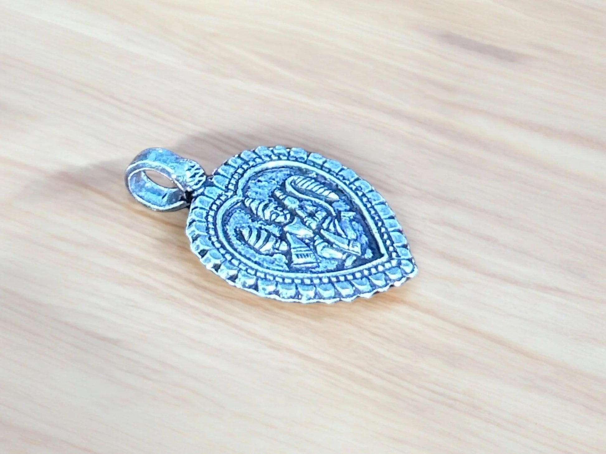 Discover the charm of this vintage handmade heart-shaped pendant featuring Lord Hanuman, crafted in sterling silver. This exquisite piece weighs 1.4 grams, with dimensions of 2 cm in width and 2.6 cm in length. Perfect for adding a spiritual touch to any outfit.